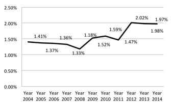 Figure 1.3 Share of the ICT industry’s output in the Chinese GDP, in percentage by year-end data (Data source: IDC Research Report (2004-2014))