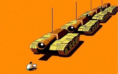 Figure 3: Anonymous reframe circulation of the iconic “tank man,” originally from the Tiananmen Square protests in China (1989), here with a new title inspired by Martin Luther King, Jr (1963): “One has the moral responsibility to disobey unjust laws.” (Illustration: Guy Billout[22])