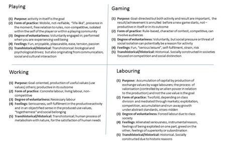 This leaves us with four concepts to understand and define in the typology: Playing, Working, Gaming and Labouring.