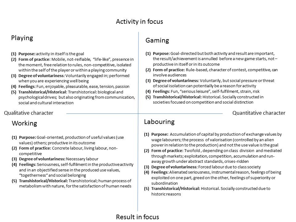 Abstract: The aim of this article is to define the concepts of playing, working, gaming, and labouring, through a literature study, and to construct a typology. This typology will be used to create a field model that is structured by the horizontal parameters of qualitative-quantitative (characteristics) and the vertical parameters of activity-result (in focus). It is shown how this model can be used to visualise different theoretical positions in empirical material, which connects to the concepts and their relations. Working and labouring are distinguished into a trans-historical and a historical, capitalist, category, and likewise playing and gaming, where the former is the trans-historical category and the latter the historical one. The main focus of the article, since working and labouring is well covered within the critical Marxist tradition, is on playing and its relation to working, with the aim of understanding and criticising the concept of playbour.